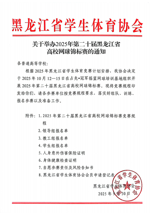 各普通高等学校: 根据2025年黑龙江省学生体育竞赛计划安排,我协会决定于2025年10月12—15日在占先•冠军摇篮网球培训基地组织开展2025年第二十届黑龙江省高校网球锦标赛。现将竞赛...