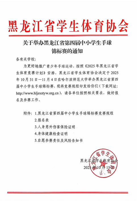各有关学校: 为更好的推广青少年手球运动,按照《2025年黑龙江省学生体育竞赛计划》安排,黑龙江省学生体育协会决定于2025年10月31日-11月4日在哈尔滨师范大学举办黑龙江省第四届中小...