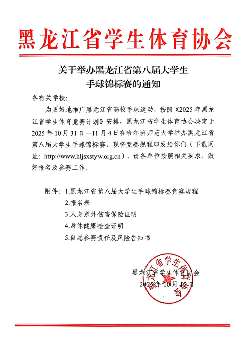 各有关学校: 为更好的推广黑龙江省高校手球运动,按照《2025年黑龙江省学生体育竞赛计划》安排,黑龙江省学生体育协会决定于2025年10月31日-11月4日在哈尔滨师范大学举办黑龙江省第八...