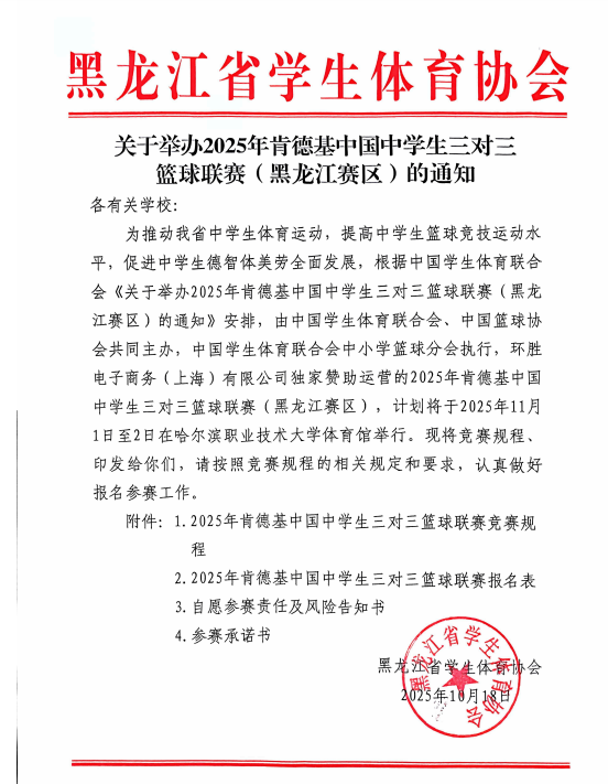 各有关学校: 为推动我省中学生体育运动,提高中学生篮球竞技运动水平,促进中学生德智体美劳全面发展,根据中国学生体育联合会《关于举办2025年肯德基中国中学生三对三篮球联赛(黑龙江赛区)的通知》安排,由...