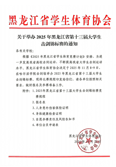 各有关学校:根据《2025年黑龙江省学生体育竞赛计划》安排,为进一步发展我省高校击剑运动,不断提高我省大学生击剑运动水平。黑龙江省学生体育协会决定于2025年11月8-9日,在哈尔滨学院击剑馆举办2025年黑龙江省第十三届大学生击剑锦标赛。...