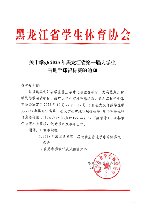 各有关学校:为搭建黑龙江省学生雪上手球运动竞赛平台,发展黑龙江省学校冬季运动项目,推广大学生雪地手球运动,黑龙江省学生体育协会决定于2025年12月27日—12月28日在大庆师范学院举办2025年黑龙江省第一届大学生雪地手球锦标赛,现将竞赛...