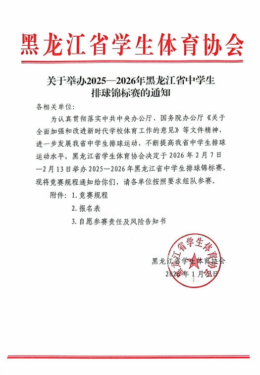 各有关学校: 为更好地推动我省中学生体育运动,提高中学生篮球运动水平,我协会决定于2025年11月27日—12月10日举办2025-2026年黑龙江省中学生篮球联赛暨2025-2026年耐...