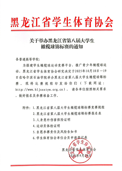 各普通高等学校: 为搭建学生橄榄球运动竞赛平台,推广青少年橄榄球运动,黑龙江省学生体育协会研究决定于2025年10月18日一19日在哈尔滨石油学院举办黑龙江省第八届大学生橄榄球锦标赛。现将...
