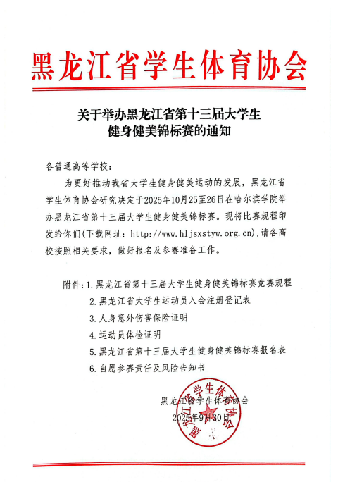 各普通高等学校: 为更好推动我省大学生健身健美运动的发展,黑龙江省学生体育协会研究决定于2025年10月25至26日在哈尔滨学院举办黑龙江省第十三届大学生健身健美锦标赛。现将比赛规程印发给...