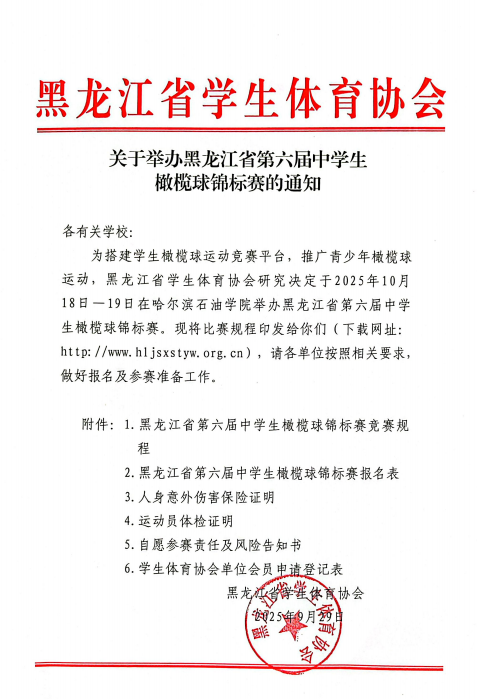 各有关学校: 为搭建学生橄榄球运动竞赛平台,推广青少年橄榄球运动,黑龙江省学生体育协会研究决定于2025年10月18日-19日在哈尔滨石油学院举办黑龙江省第六届中学生橄榄球锦标赛。现将比赛...