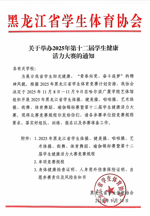 各有关学校: 为展示我省学生阳光健康,“青春向党、奋斗逐梦”的精神风貌。根据2025年黑龙江省学生体育竞赛计划安排,我协会决定于2025年11月8日—11月9日在哈尔滨广厦学院艺体馆组织开...